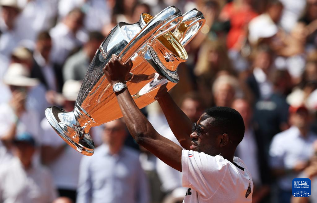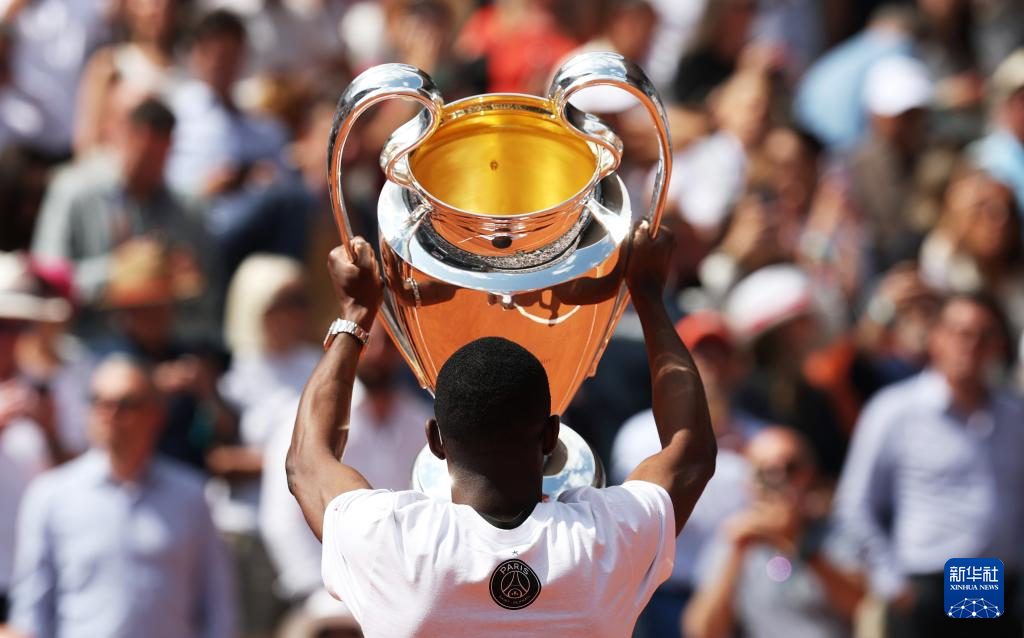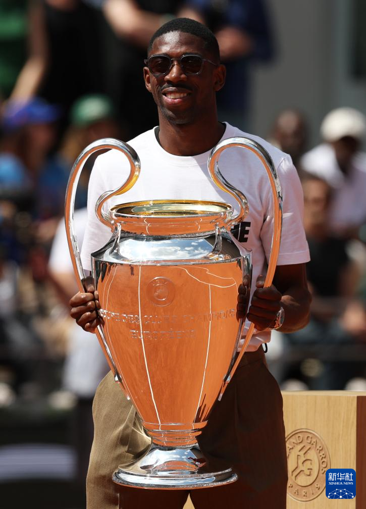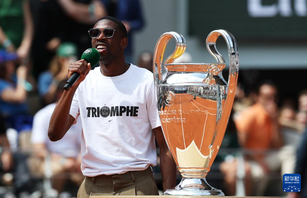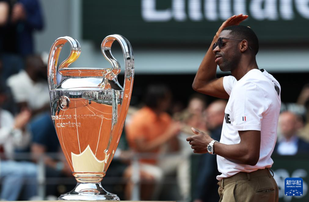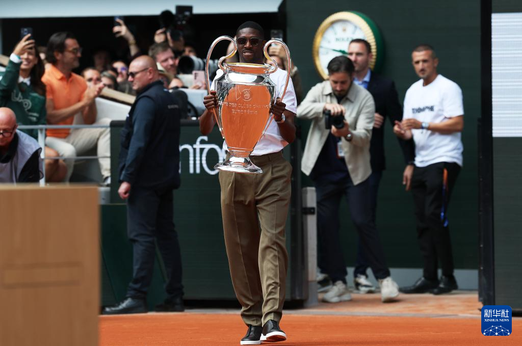 6月2日,法甲巴黎圣日耳曼队前锋登贝莱手捧欧冠冠军奖杯现身法网中央球场。