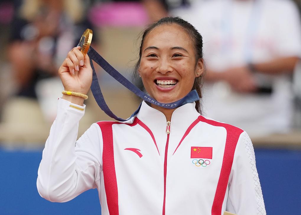 2024年8月3日,郑钦文在巴黎奥运会网球女子单打颁奖仪式上。新华社记者 万象 摄