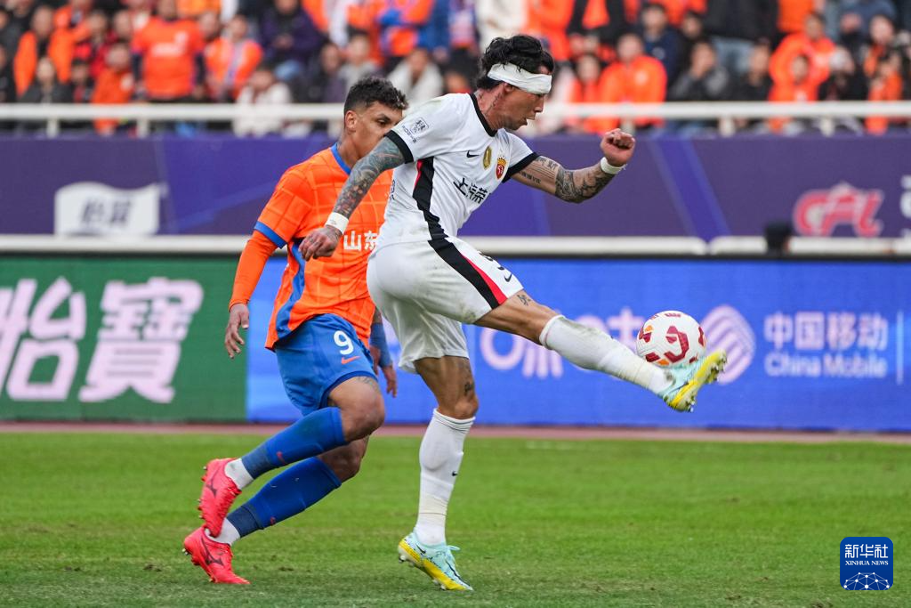 10月26日,山东泰山队球员卡扎伊什维利(前)在比赛中射门。
