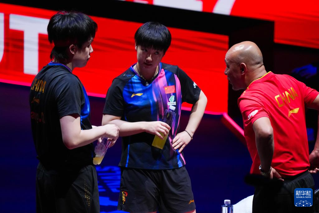 12月12日,中国队教练肖战(左)在比赛暂停时指导王楚钦(中)/孙颖莎。