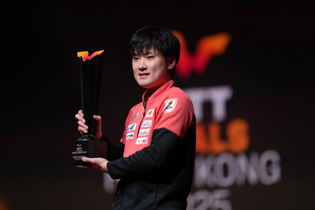 12月14日,男单冠军日本选手张本智和在颁奖仪式上。新华社发(吕小炜摄)