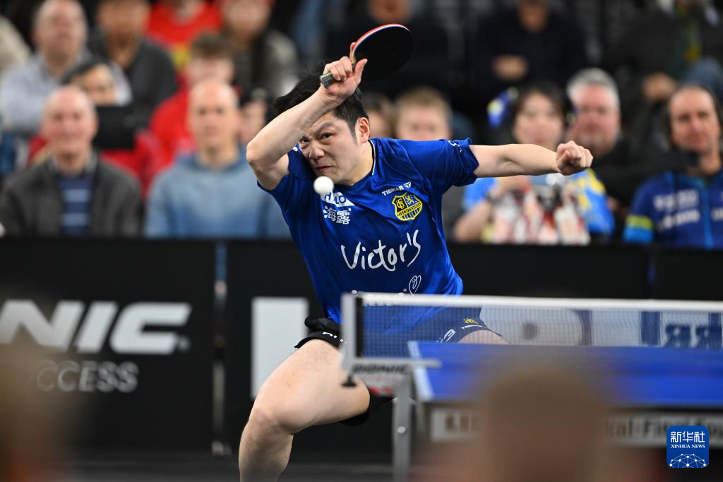 1月4日,萨尔布吕肯队球员樊振东在男子单打比赛中回球。最终他3比0战胜富尔达-马伯策尔队球员奥恰洛夫。