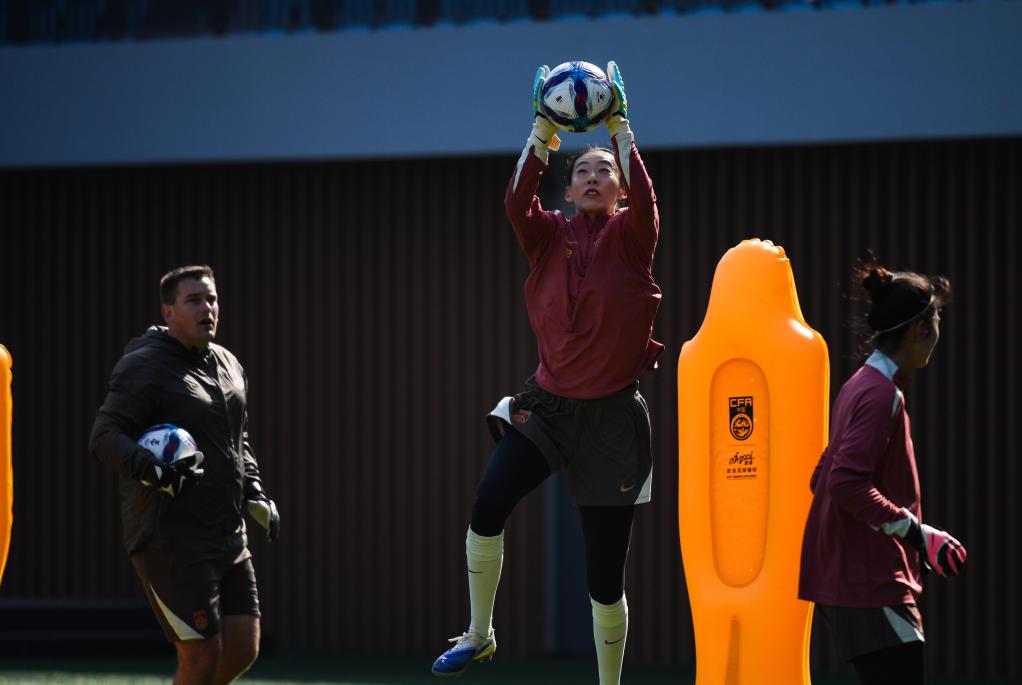 1月6日,中国女足守门员陈晨(中)在训练中。新华社记者 毛思倩 摄