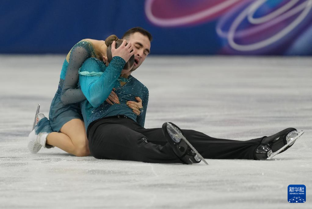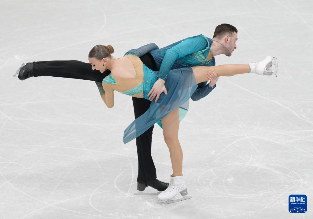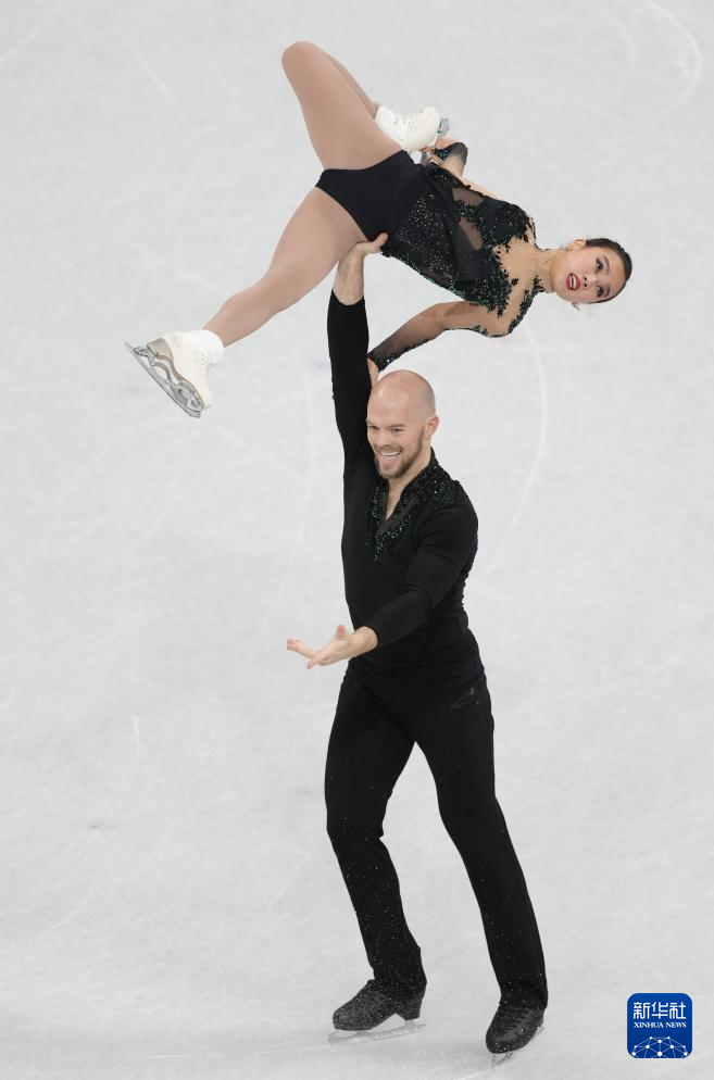 2月8日,加拿大队组合佩雷拉(左)/米肖在团体赛双人滑自由滑比赛中。
