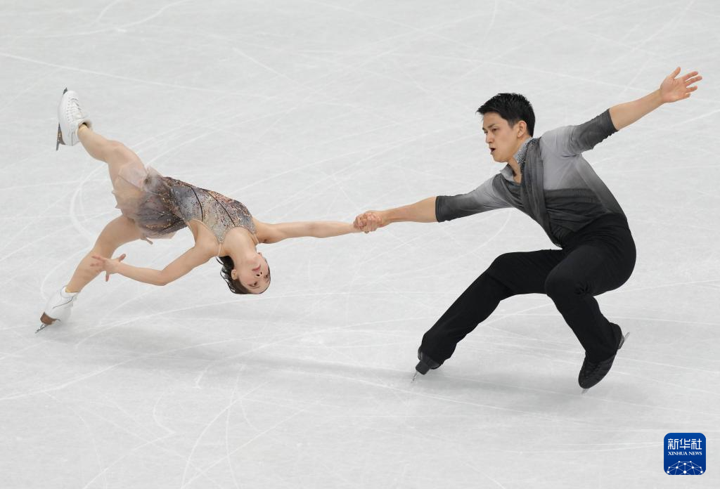 2月8日,日本队组合三浦璃来(上)/木原龙一在团体赛双人滑自由滑比赛中。