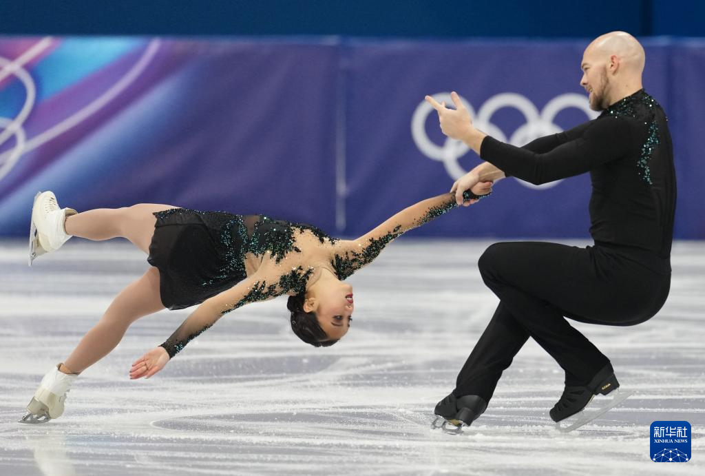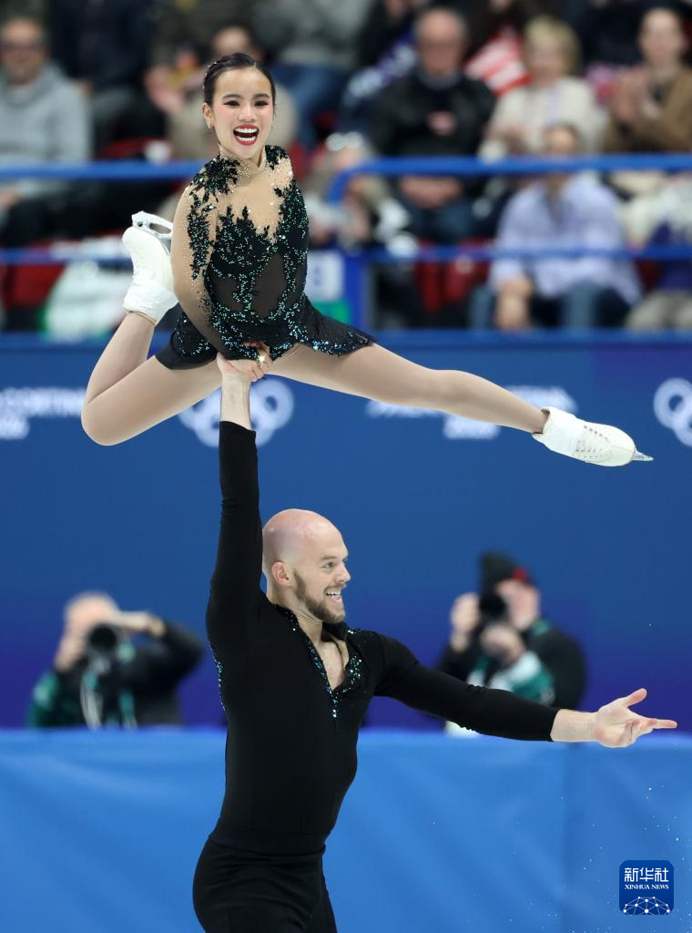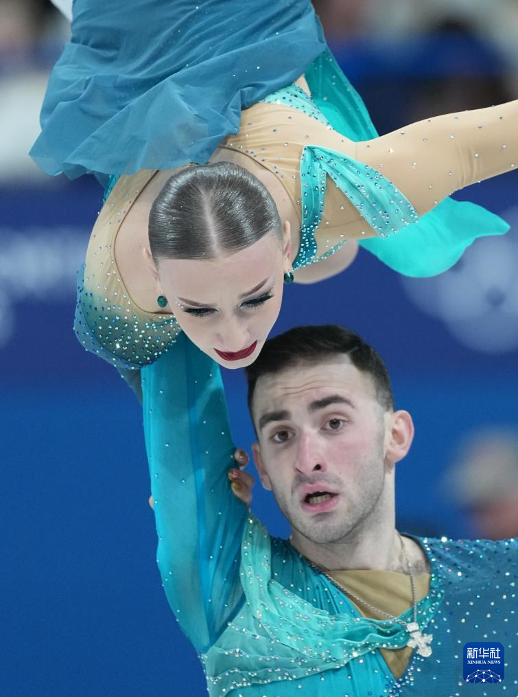 2月8日,格鲁吉亚队组合阿纳斯塔西娅·梅特尔基娜(右)/卢卡·别鲁拉瓦在团体赛双人滑自由滑比赛中。