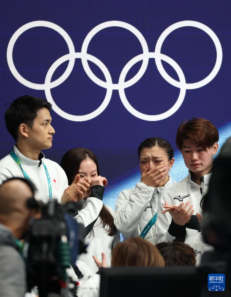 2月8日,日本队选手坂本花织(中)在团体赛女单自由滑完赛后等待成绩。