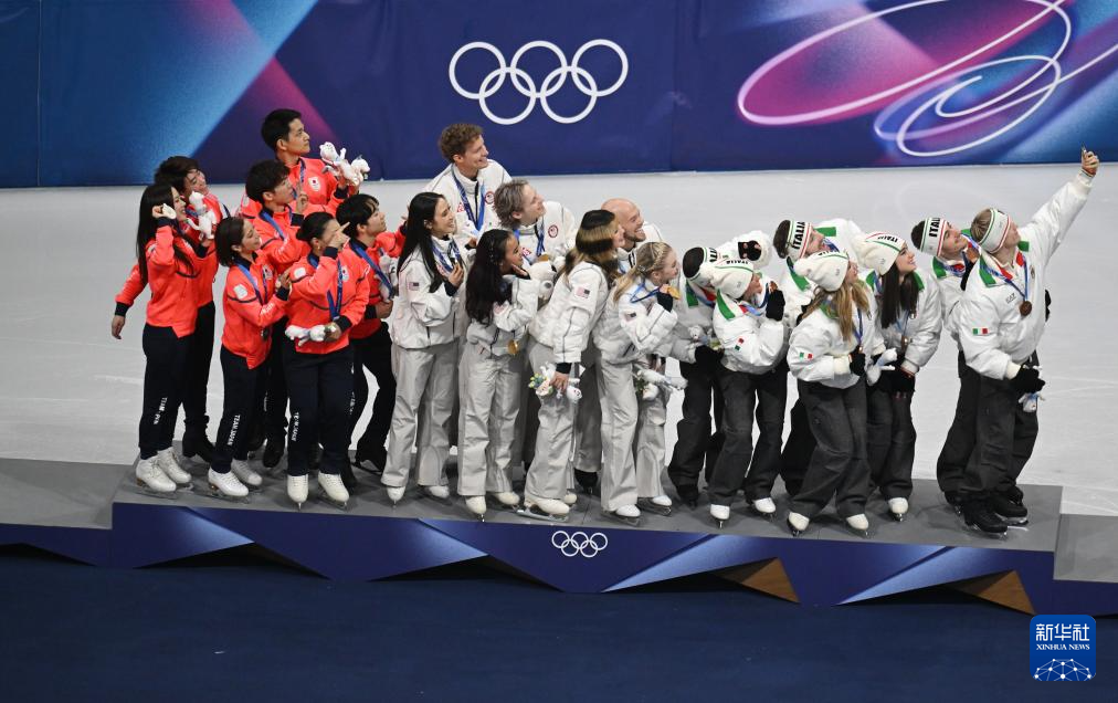 2月8日,美国队(中)、日本队(左)和意大利队在颁奖仪式上合影。