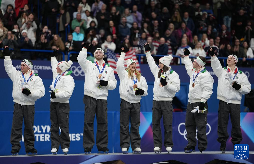 2月8日,美国队(中),日本队(左)和意大利队在颁奖仪式上合影。