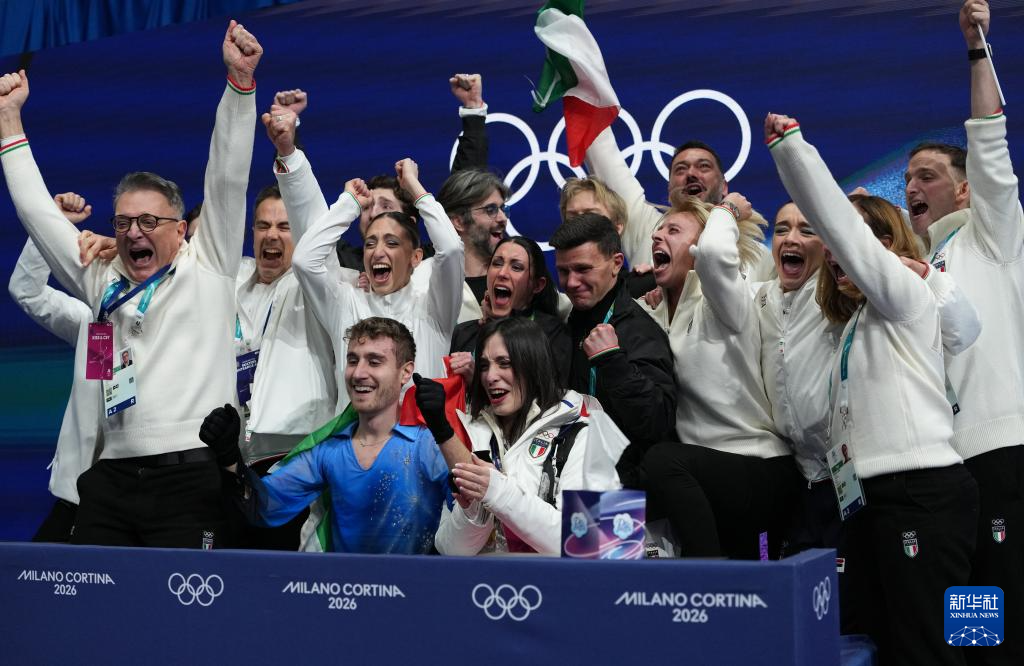 2月8日,意大利队在团体赛男单自由滑完赛后庆祝。