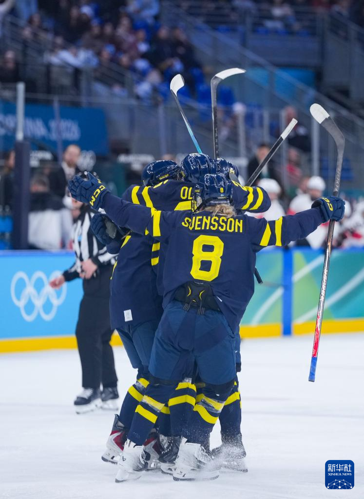 2月19日,瑞典队球员在比赛中庆祝进球。