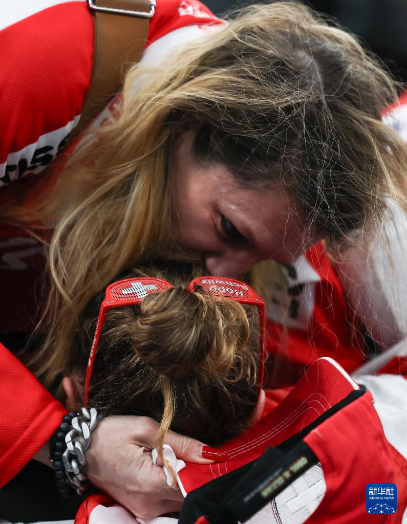 2月19日,瑞士队球员阿林娜·米勒(下左)在加时赛中攻入制胜球后庆祝。