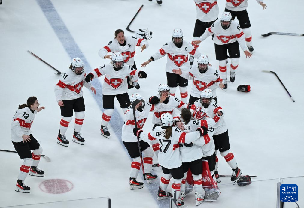 2月19日,瑞士队球员阿林娜·米勒(中)在加时赛中攻入制胜球后庆祝。
