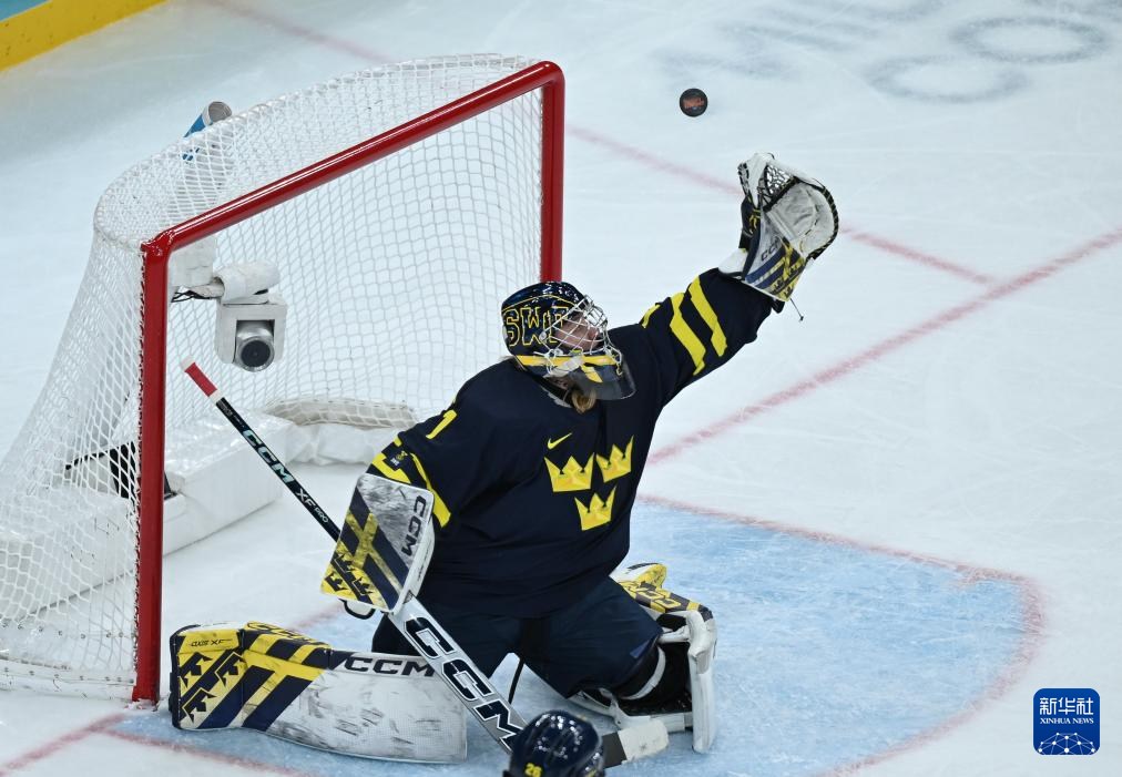 2月19日,瑞典队门将埃芭·斯文松在比赛中扑救。