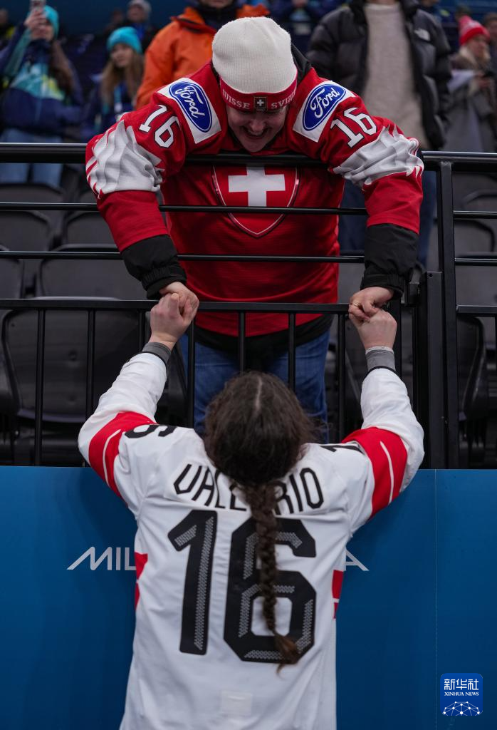 2月19日,瑞士队球员阿林娜·米勒在赛后庆祝胜利。