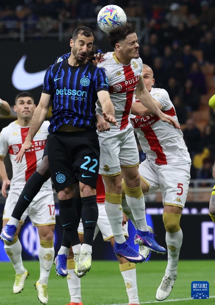 2月28日,国际米兰队球员姆希塔良(上左)与热那亚队球员维蒂尼亚(上右)在比赛中争顶。