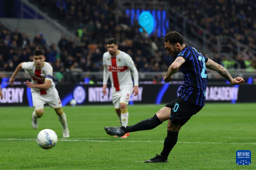 2月28日,国际米兰队球员恰尔汗奥卢(右)在比赛中罚中点球。
