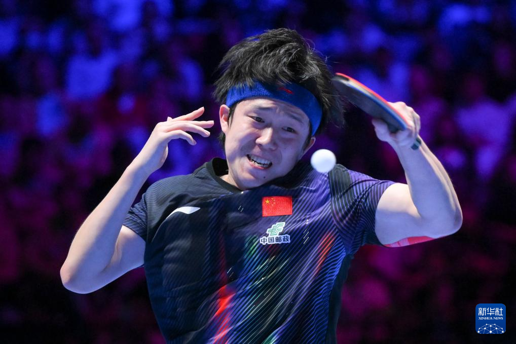 4月5日,中国选手王楚钦在比赛中回球。