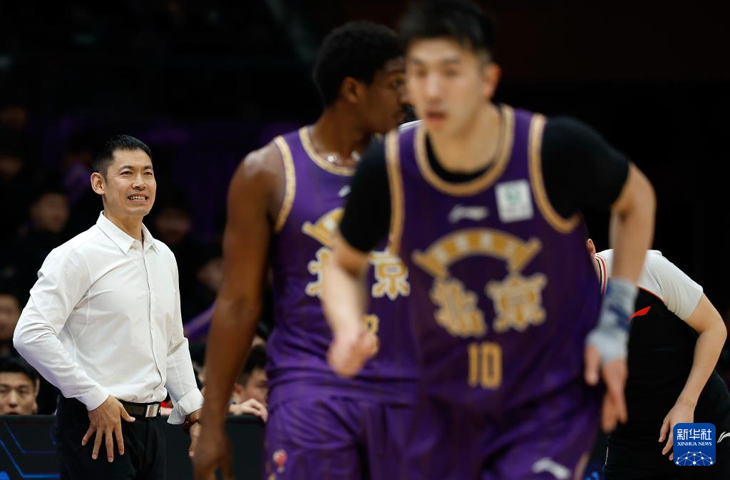 4月4日,北京控股队主教练张庆鹏(左)在场边。