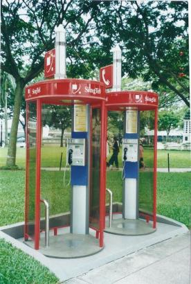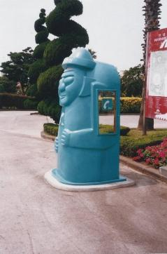 有一种钢盔式的电话亭曾经在很多国家流行。这种电话亭的设计特别简单,一个可以遮阳挡雨的大钢盔罩着电话机,也罩着打电话的人,成本低,效果好,配上不同的色彩,也不失美观。