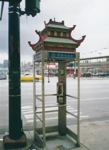 美国芝加哥唐人街电话亭的造型也很别致,小小电话亭上是两层的中式大屋顶。