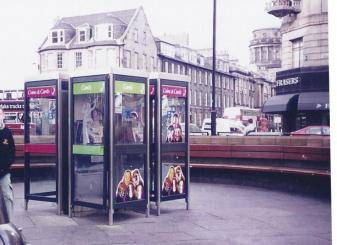 电话亭大多设置在城市中人口流动量最大的地方,广告商们都青睐这样的地段,他们希望在电话亭的四周做广告。但是,电信运营商们约定俗成,电话亭四周通常不做广告,目的是为了让电话亭的标记更明显。偶尔也有例外的,我在英国苏格兰的爱丁堡就看到过带广告的电 话亭。这样的电话亭看起来很别扭。