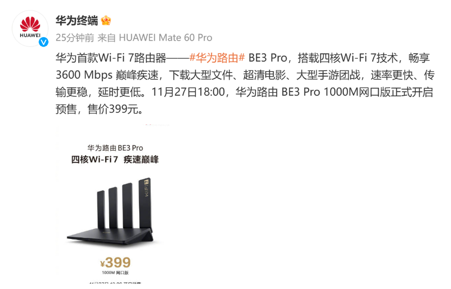 华为路由 BE3 Pro正式预售,开启Wi-Fi 7新篇章
