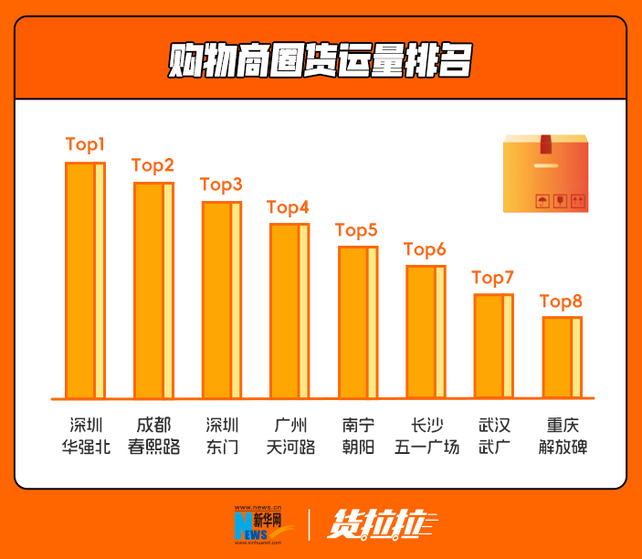 在城市中,购物商圈往往成为当地的消费热土,创造城市新活力。《报告》显示,全国各地的购物商圈货运量中,深圳华强北、成都春熙路、深圳东门位列前三甲,第4至8名分别是广州天河路、南宁朝阳商圈、长沙五一广场、武汉武广商圈、重庆解放碑。