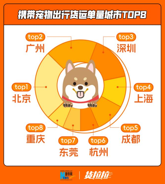 《报告》显示,北京市民携带宠物约平台货车出行最多,广州、深圳、上海、成都、杭州、东莞、重庆等城市的宠物出行订单数分别位列第2至第8名。