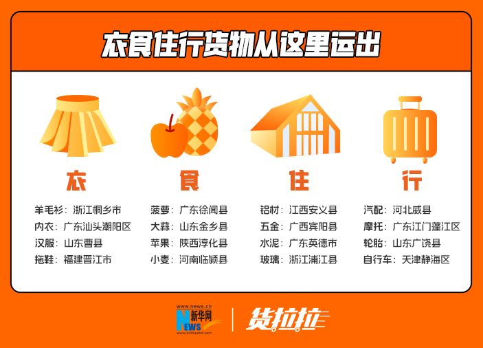 《报告》显示,很多城市有着与老百姓衣食住行相关的产业集群,货运量较大。如在“衣”方面,浙江桐乡市的羊毛衫引领时尚;在“食”方面,广东徐闻的菠萝撩拨着人们的味蕾;在“住”方面,江西安义县的铝材畅销全国;在“行”方面,广东江门蓬江区的摩托车扬名海外。