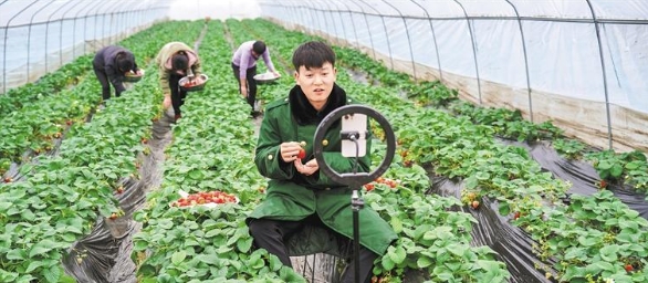 图 2023年12月21日,四川省眉山市彭山区观音街道五湖社区草莓种植基地,农场职工正通过直播销售草莓。翁光建摄(中经视觉)