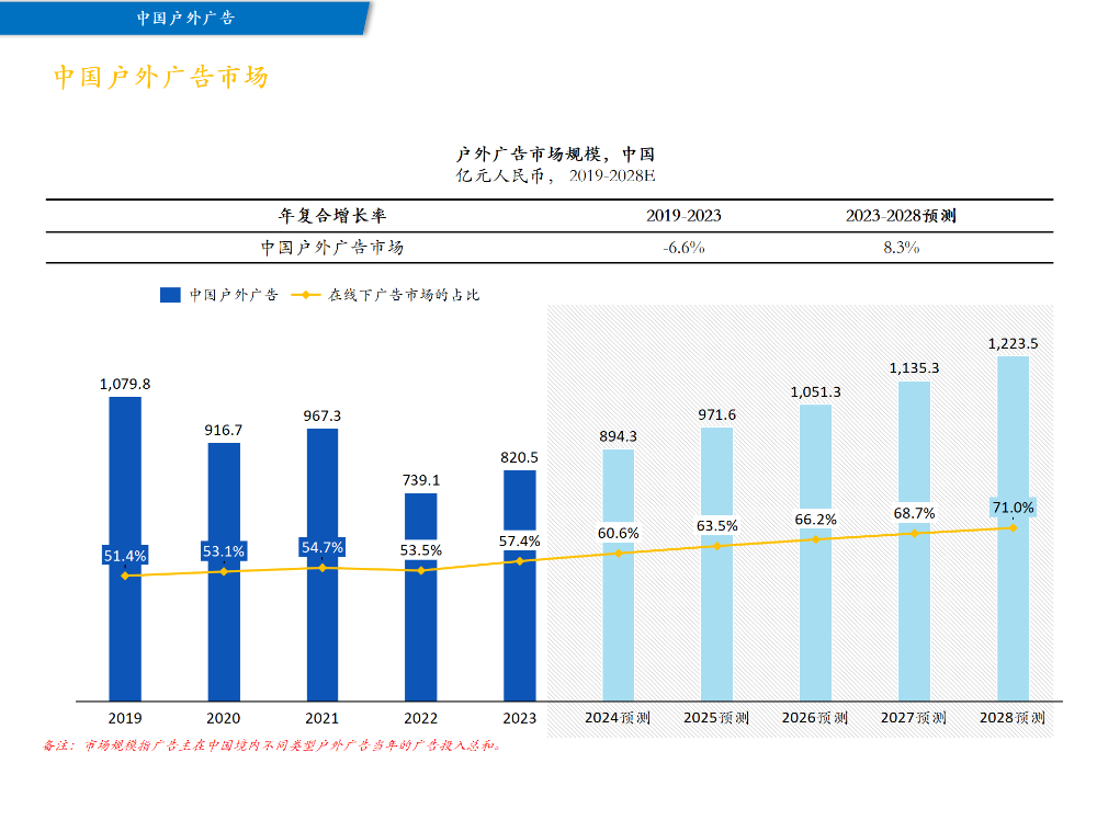 根据中国广告协会《2023年全球及中国户外广告市场报告》显示,2023年中国户外广告市场规模达到约820.5亿元,同比增长约11.01%。户外广告以其高可见性和广泛的曝光触达能力,呈现出了较好的复苏态势。