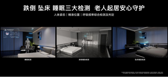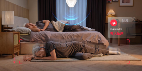 例如卧室床边如果发生跌落,AI辅助康养传感器会识别出是以什么姿态跌倒,判断后会及时上报并且向监护人发送告警通知。同时在卧室起夜离床过久的检测中,可以识别长时间未归判断是否出现紧急情况。像卫生间这种极易出现跌倒的空间,也可以通过传感器检测到是否有跌倒情况,并及时通知监护人。睡眠时长也可通过睡眠计划设置,如果超过固定起床时间,长时间卧床后也会被判定为存在危险,并进行告警。