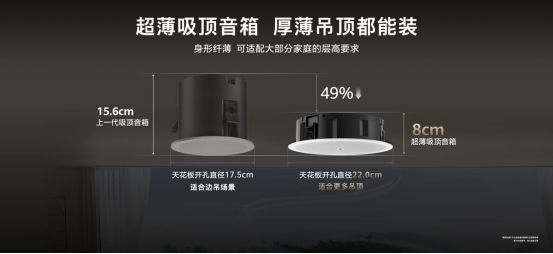 此外,华为全屋智能解决方案新版本带来了超薄吸顶音箱,其采用8cm超薄音腔设计,较现款吸顶音箱更薄,减少了近一半的厚度,仅需90mm嵌墙深度即可安装。同时采用PLC组网的全屋音乐系统,由HUAWEI SOUND软硬件技术能力塑造巅峰的音质体验,通过分布式的HarmonyOS实现无处不在、随心流转的播控体验。