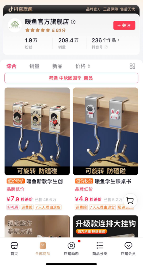 暖鱼品牌还积极与抖音平台上的达人合作,通过纯佣带货的模式推广。在抖音电商的支持下,暖鱼品牌的销售业绩实现了突破。暖鱼负责人透露:“目前挂钩类产品已经有30多款在售,我们也开始尝试拓展其他类目,如纺织品等,都取得了不错的成绩。”