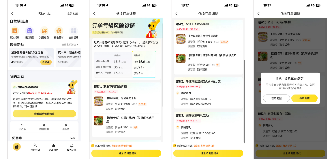 商家因设置活动不合理导致收入较低,平台预警后提供一键减负建议