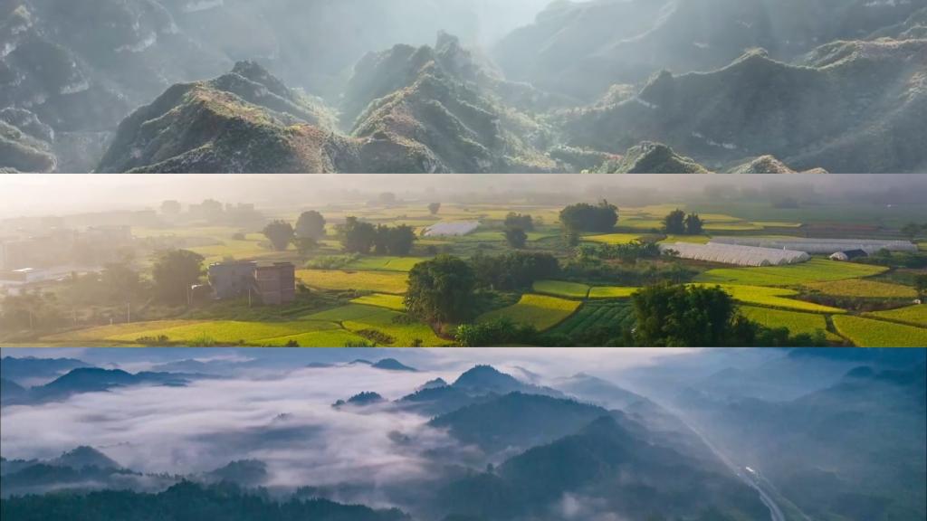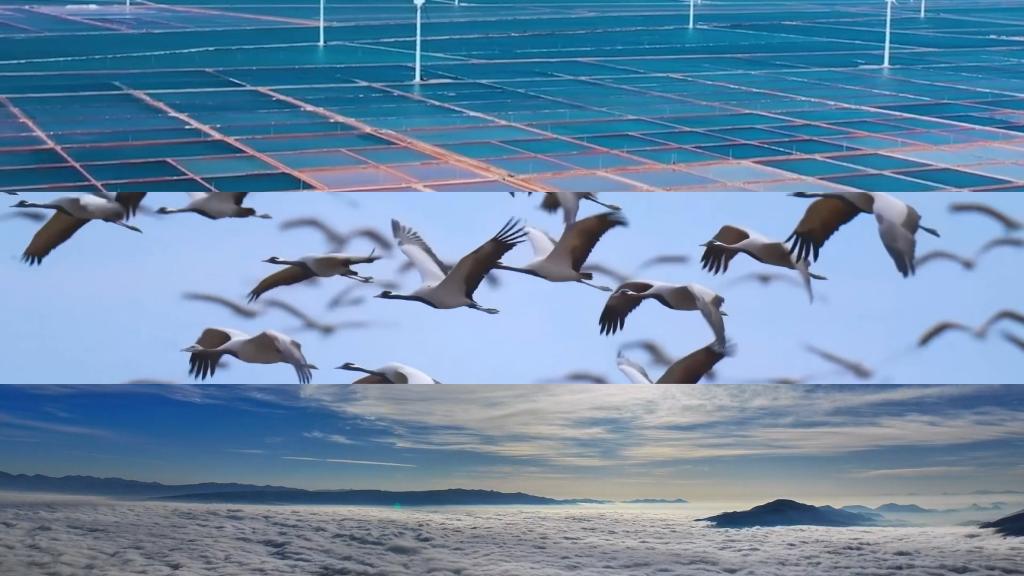 云南永善千亩梯田,一派丰收景象;贵州铜仁,秋日云海景观浩瀚缥缈;新疆额尔齐斯河流域,成群候鸟飞翔在湖光秋色之中。