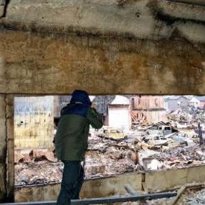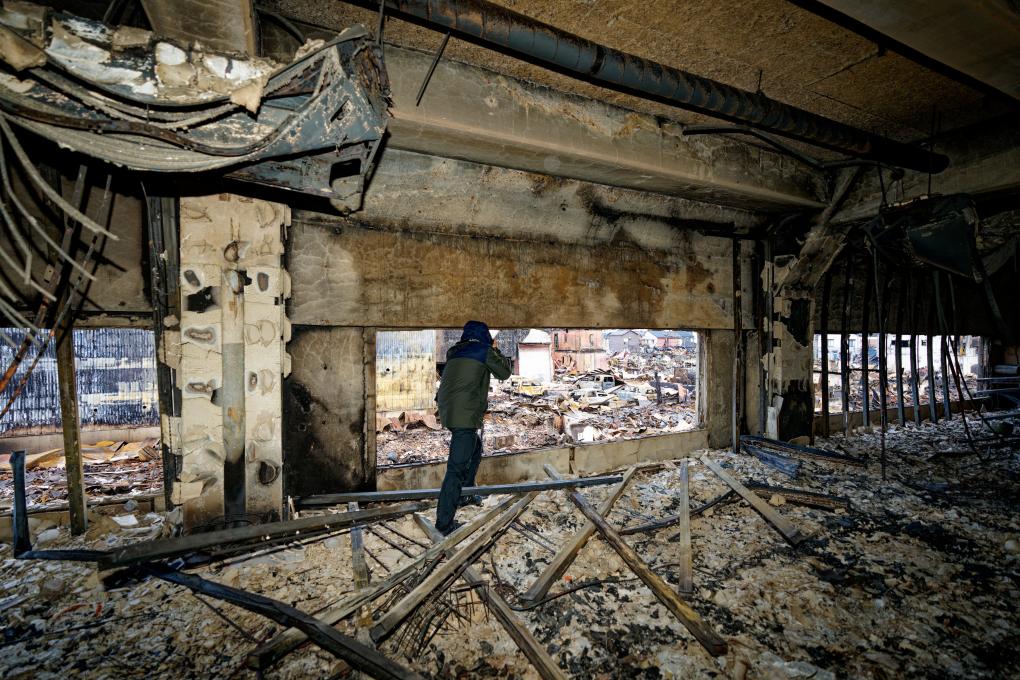 ↑1月4日,记者张笑宇在日本石川县轮岛市“轮岛早市”上被烧毁的大楼内拍摄。