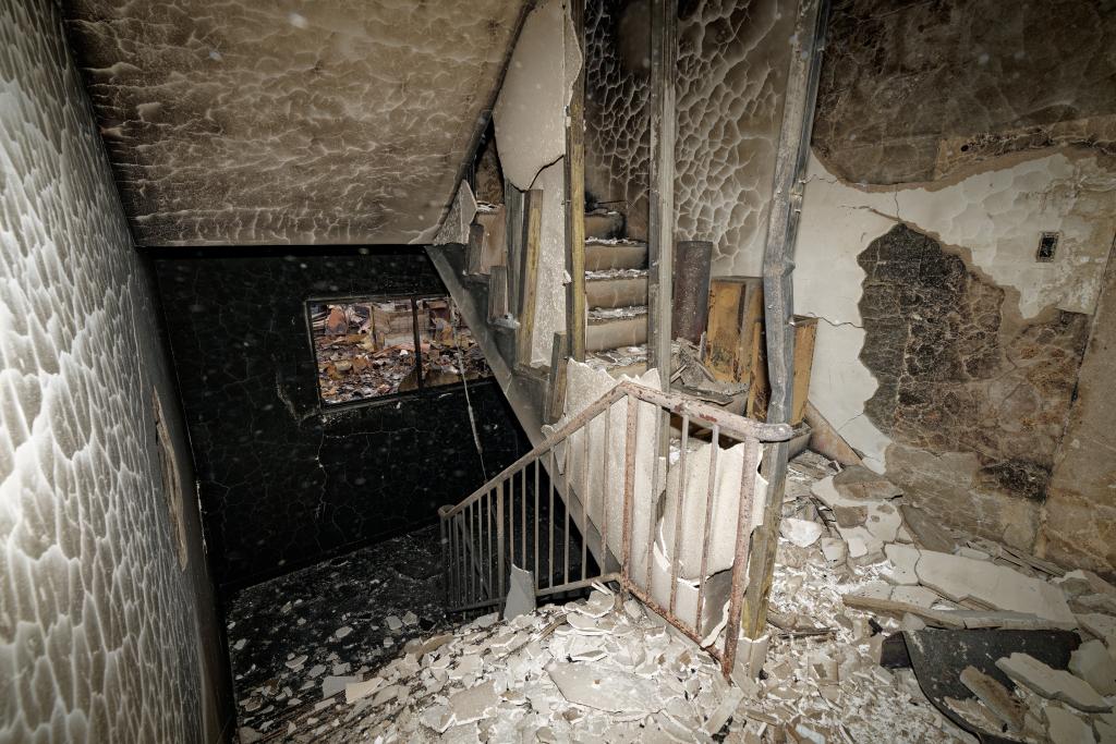 4日,迎着缓缓升起的朝阳,我们站在了火灾的废墟前。日本禁飞无人机,本地媒体能用直升机拍摄全景,而我们能去哪里找到高点拍摄呢?最终我与视频记者选定了一个烧焦了但是整体结构还在的大楼,准备探索是否能去到楼顶。这个决定颇有挑战性——灾区此时还余震不断。新闻人的责任感给了我们勇气,我们在废墟中爬到了顶楼,完成了报道。