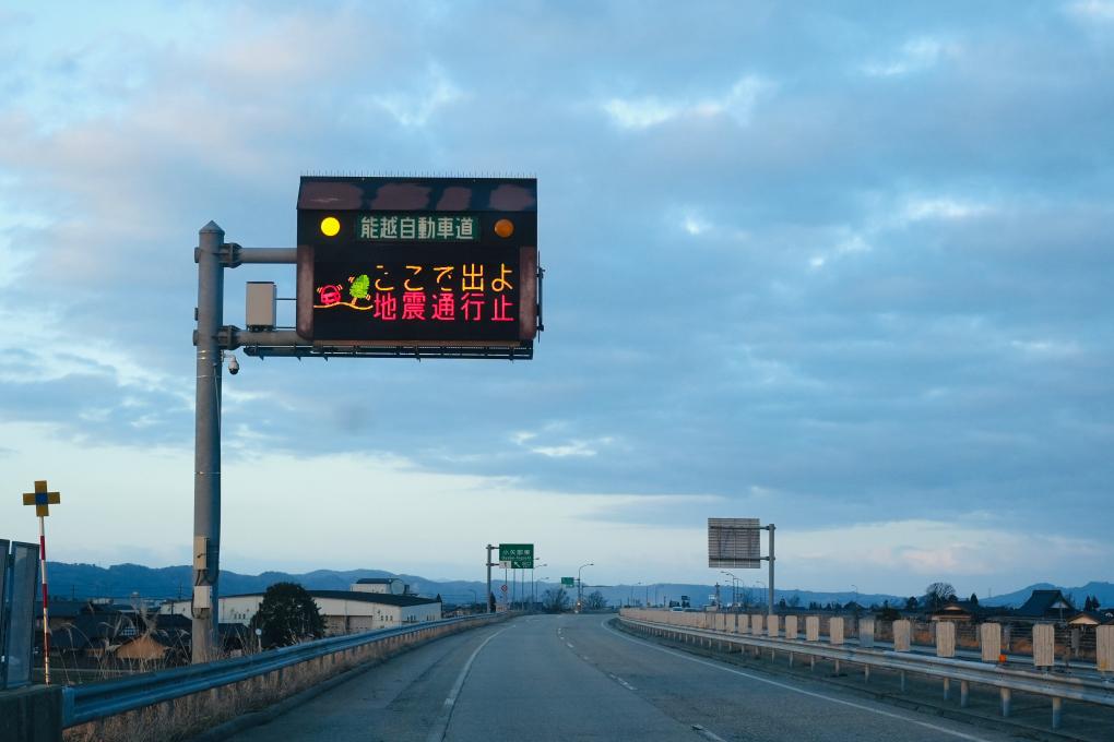 ↑1月1日,日本富山县小矢部市的高速公路因地震关闭,指示牌提示从此驶出高速公路。 新华社发(孙佳林 摄)