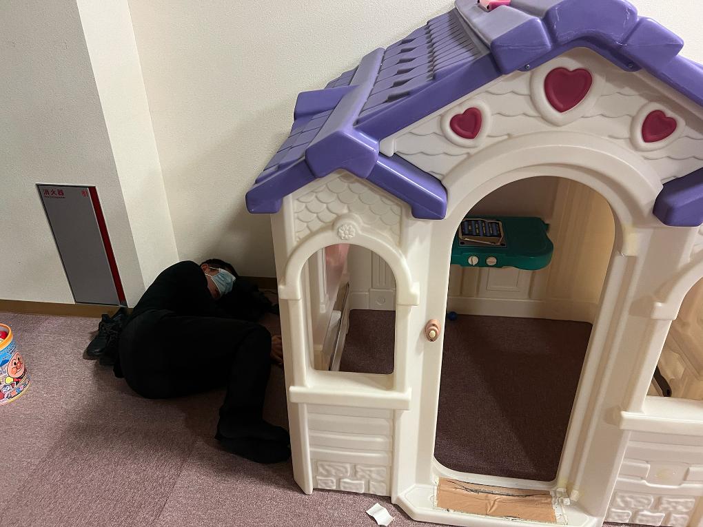 ↑1月3日,记者张笑宇在日本石川县轮岛市的一个避难所小憩。