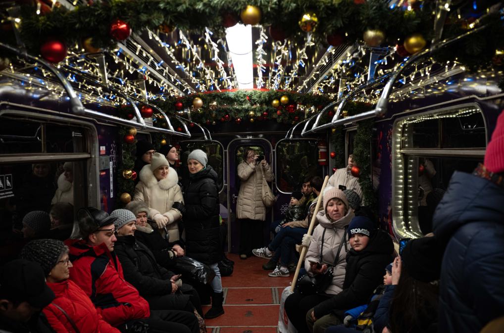 1月1日,人们在俄罗斯首都莫斯科乘坐地铁新年专列。(新华社记者白雪骐摄)