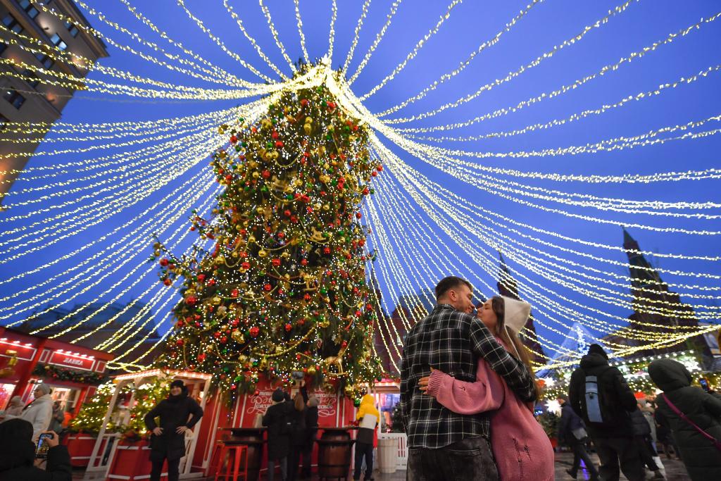 2023年12月21日,在俄罗斯首都莫斯科,人们在新年枞树下拥抱。新华社发(亚历山大摄)