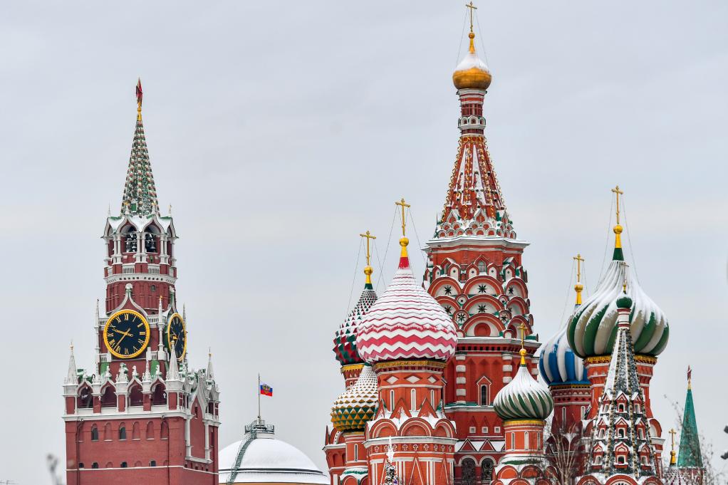 这是1月6日在俄罗斯首都莫斯科拍摄的雪后克里姆林宫(左)和圣瓦西里教堂。(新华社记者曹阳摄)