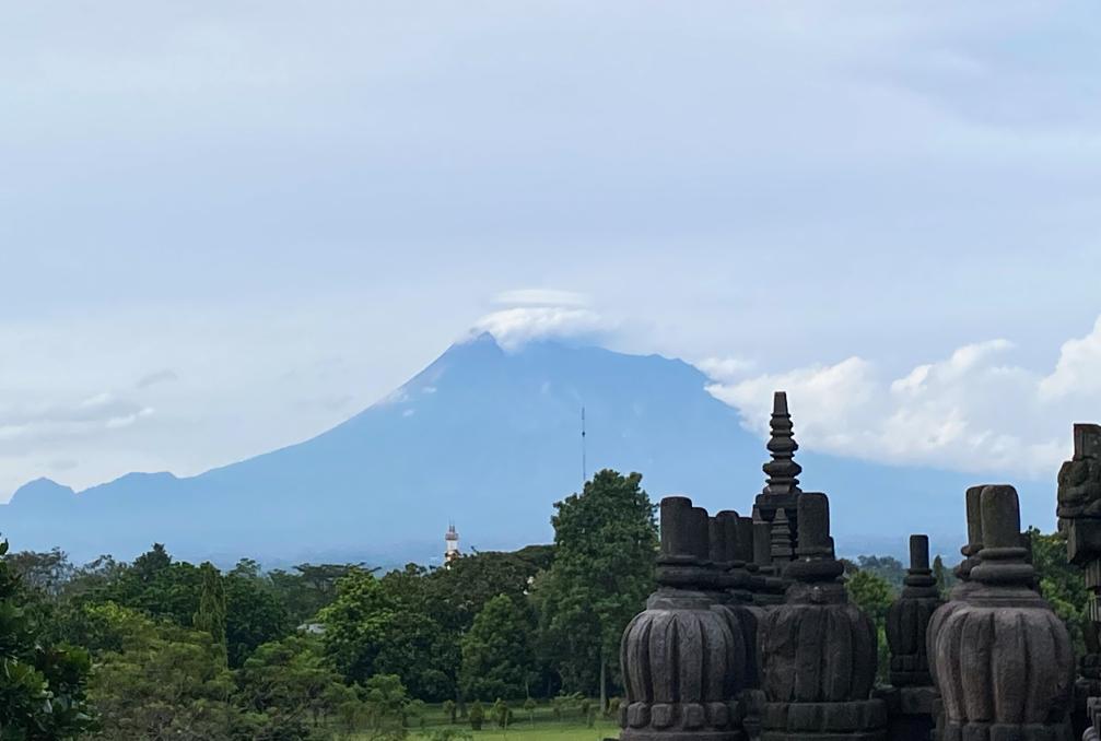 图为2023年2月4日在印度尼西亚日惹特区拍摄的巴兰班南神庙一角和远处的默拉皮火山。新华社记者徐钦摄