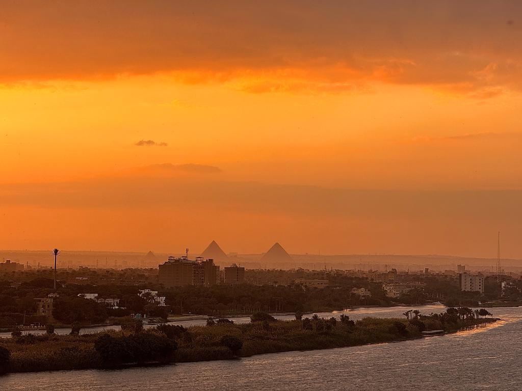 这是1月27日在埃及首都开罗拍摄的尼罗河上的晚霞,远处是吉萨大金字塔。新华社记者王东震摄