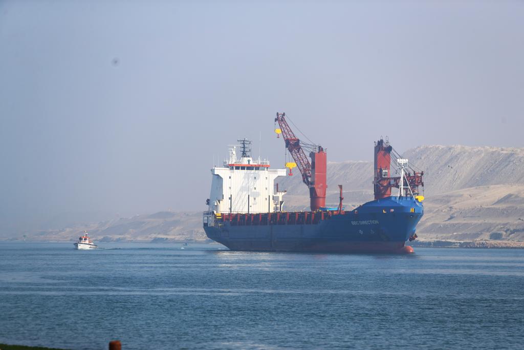 1月13日,在埃及伊斯梅利亚省,一艘货轮行驶在苏伊士运河上。新华社发(艾哈迈德·戈马摄)