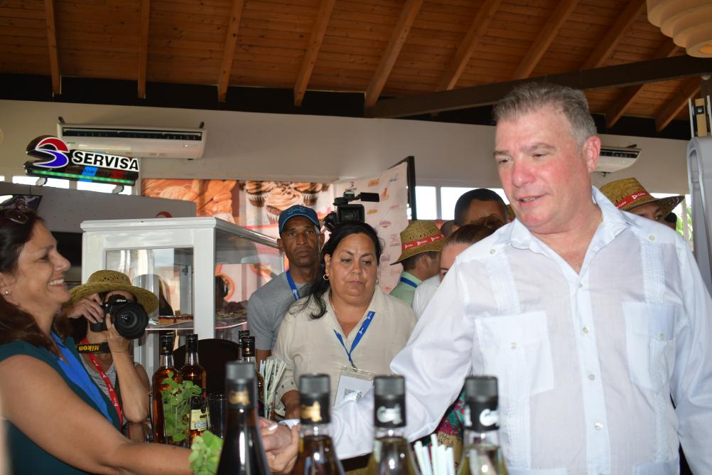 5月2日,古巴旅游部长加西亚(右一)在谢戈德阿维拉省举行的第42届古巴国际旅游博览会展区同参展商交谈。新华社记者林朝晖摄