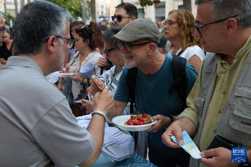 6月13日,民众在意大利布林迪西参加集会现场的义餐活动。新华社记者 孟鼎博 摄