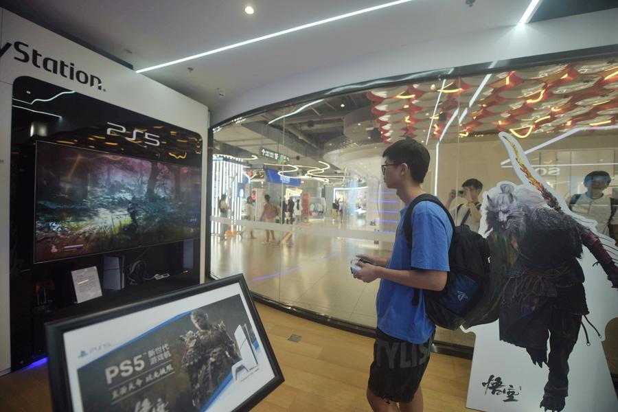 8月20日,游戏爱好者在杭州一家索尼门店通过游戏机体验游戏《黑神话:悟空》。新华社发(龙巍摄)